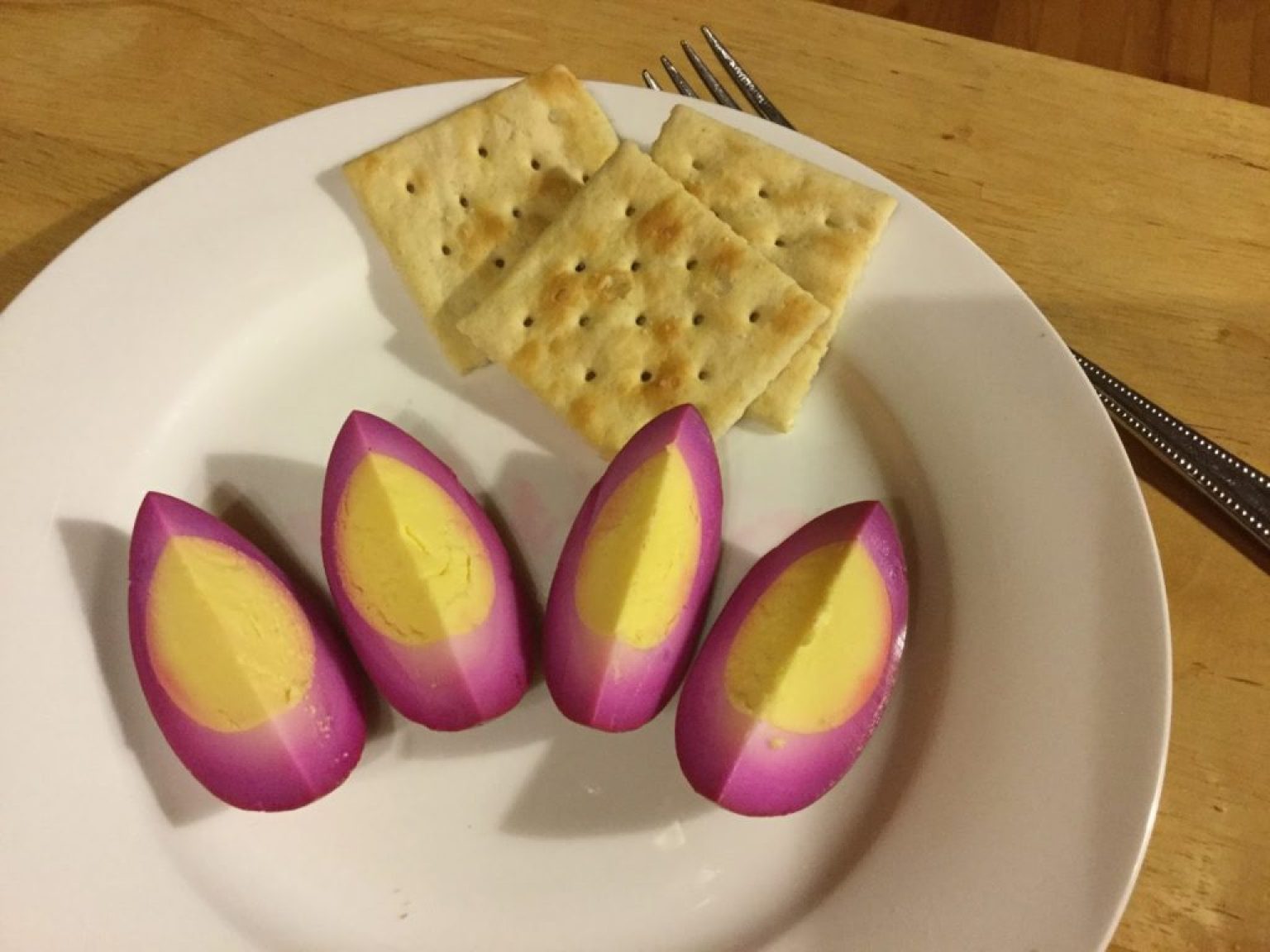 Mélanger le vinaigre et le jus de betterave et ajouter aux œufs.