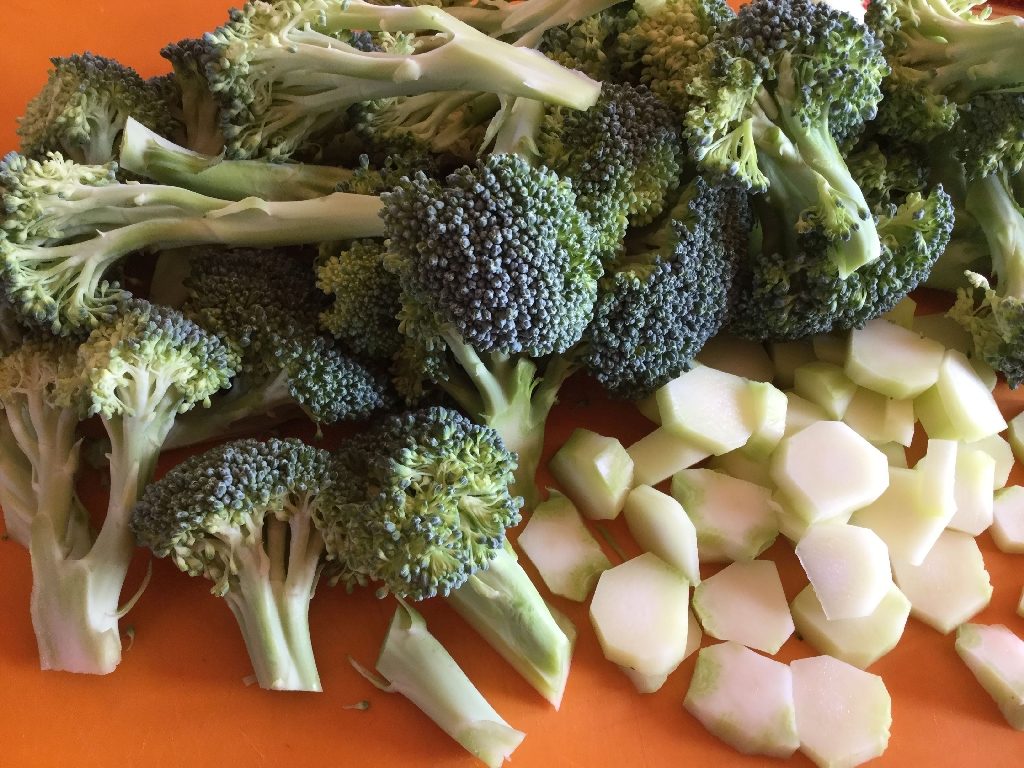 Séparer les grosses tiges de la tête du brocoli. Peler et trancher finement les tiges. Défaire la tête en petits bouquets et peler une partie des plus grosses tiges des bouquets.